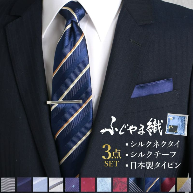 日本製のシルク100%ネクタイ+チーフ+タイピン 【ふじやま織ネクタイ・チーフ・タイピンセット】 クリアラッピング付きでギフトにもぴったり 12種から自由に選べる!
