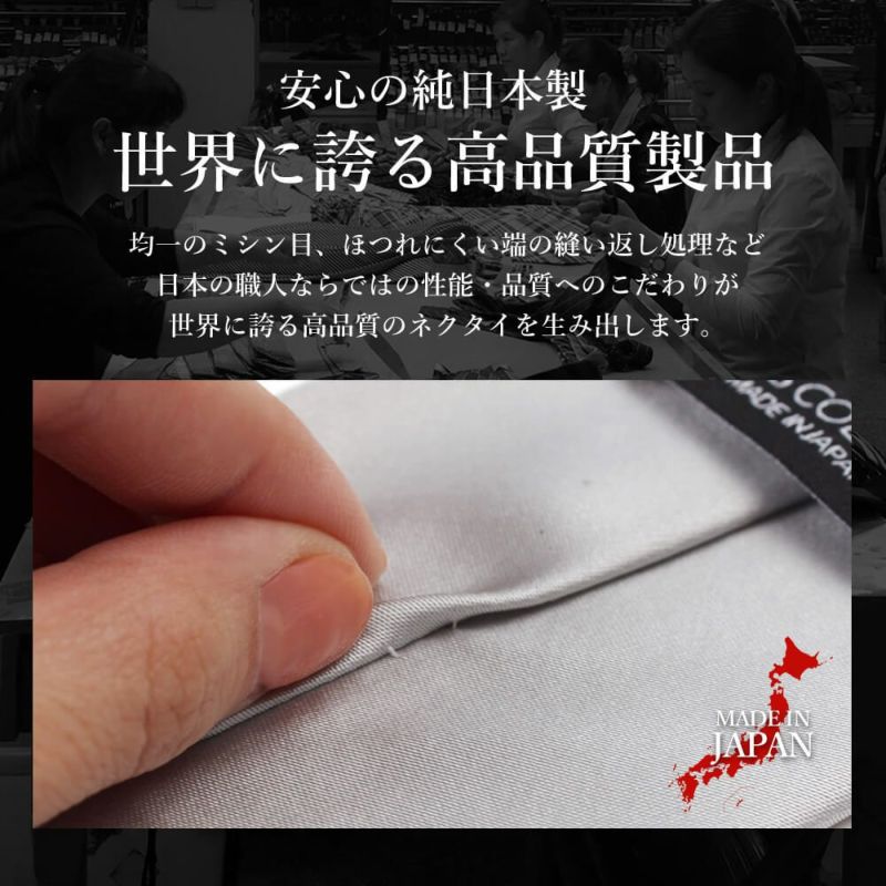 ネクタイ、チーフ、タイピンすべて日本製。ネクタイとチーフはシルク100%の生地を使用しています。