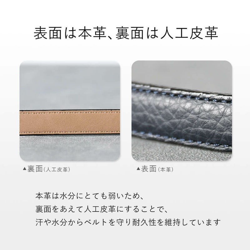 長く使える上質な本革はイタリアの本革を使用し国内の職人が丁寧に仕上げた日本製。本革だからこそ馴染がよく、使うごとに深くなる色味の変化もお楽しみいただけます。しかし、本革は水分にとても弱いため、汗の書きやすい裏面は人工皮革にすることで耐久性も維持しています。
