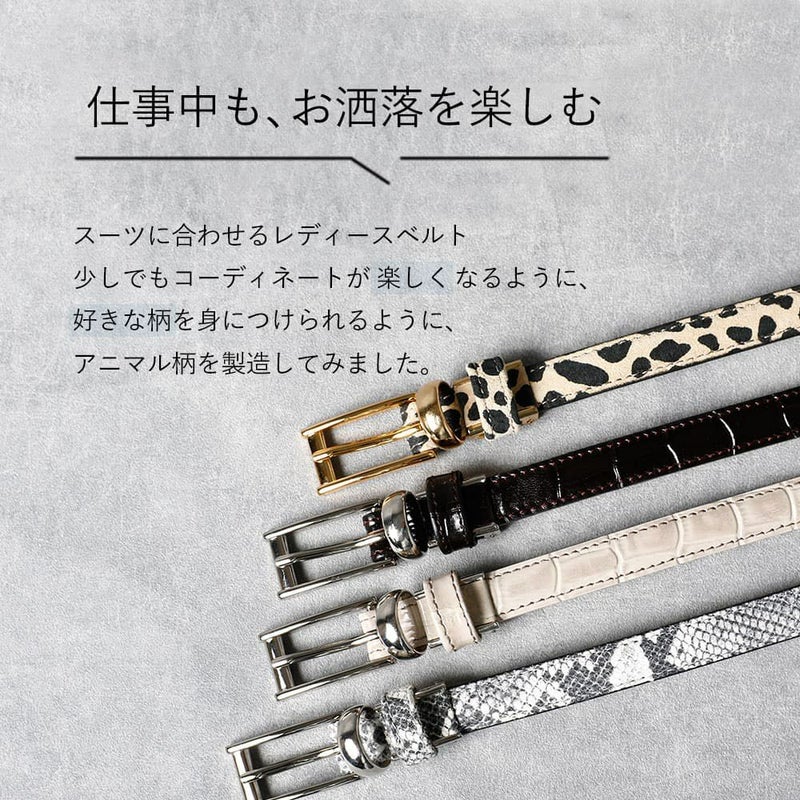 スーツに合わせるレディースベルトが少しでもコーディネートが楽になるように、好きな柄を身に着けられるように、アニマル柄を製造しました。