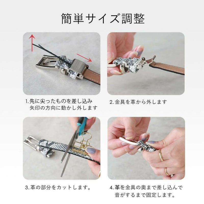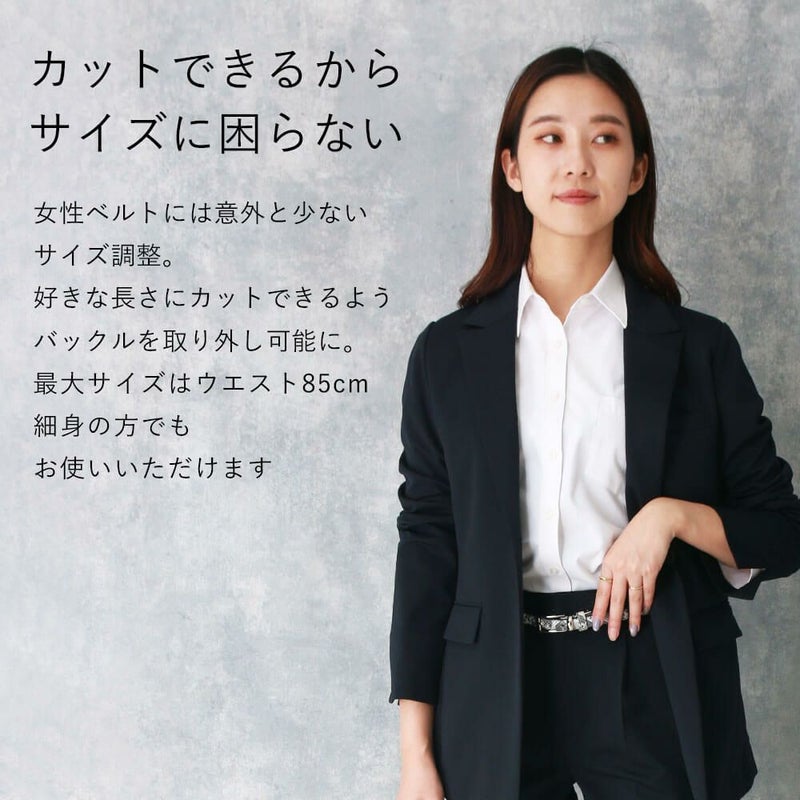 女性ベルトには意外と少ないサイズ調整機能。好きな長さにカットできるようにしました。最大サイズはウエスト85cmで細身の方もお使いいただけます。