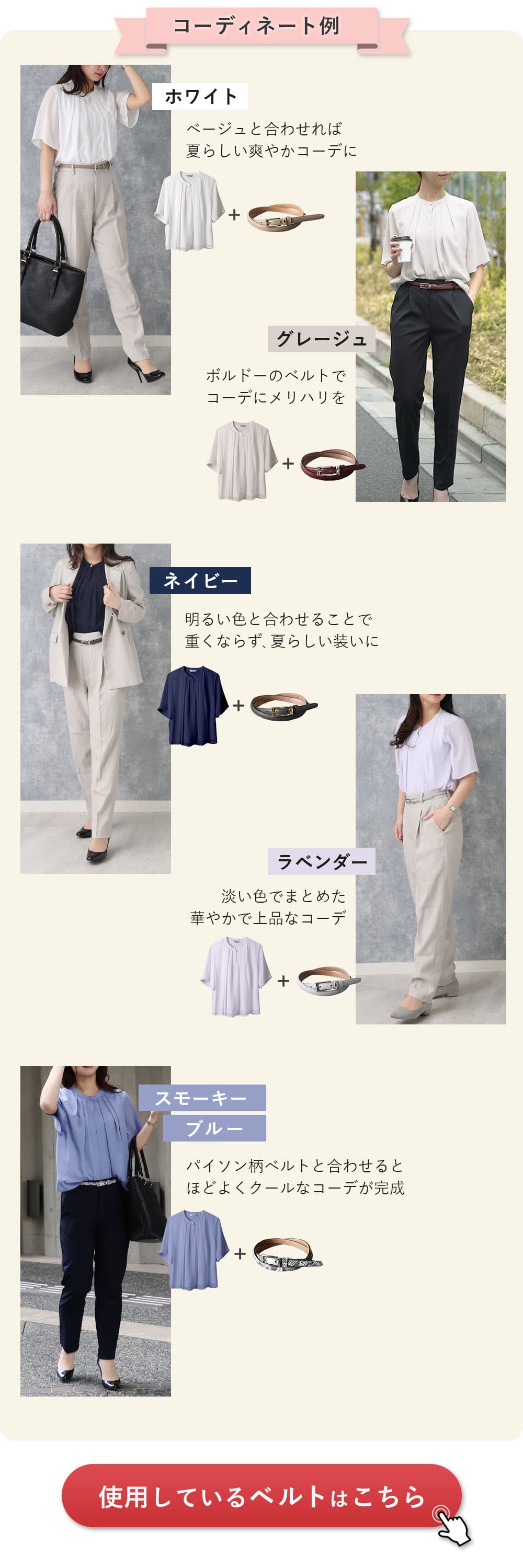 ホワイトやネイビーは卒入学式のブラウスとしてもおすすめの色味。インでもアウトでも問題ない丈感と胸元の安心感がポイントです!ジャケットとの相性も抜群。