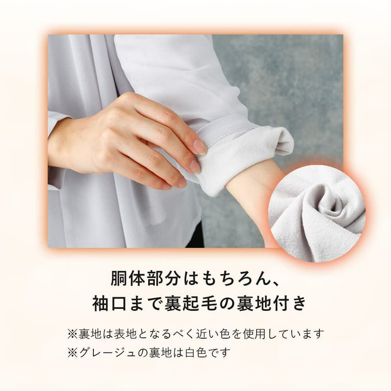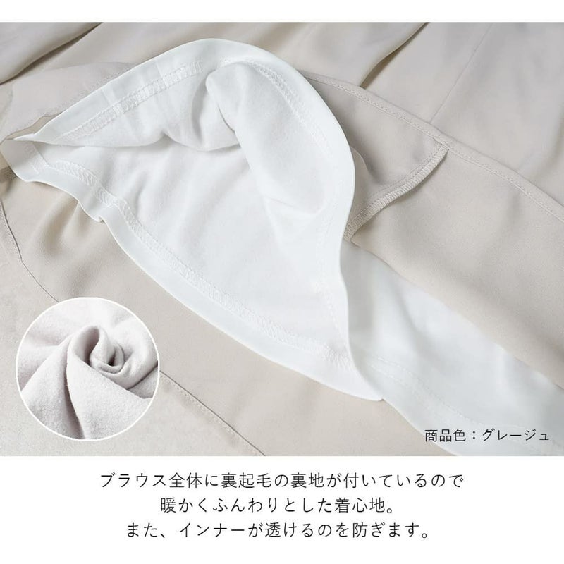 ブラウス全体に裏起毛の裏地をつけているので、ふんわり暖かい着心地。また、インナーの色が透けにくく、安心してご着用いただけます。裏地はできるだけ表地の色と近い生地を使用しています。(※グレージュの裏地は白色です)