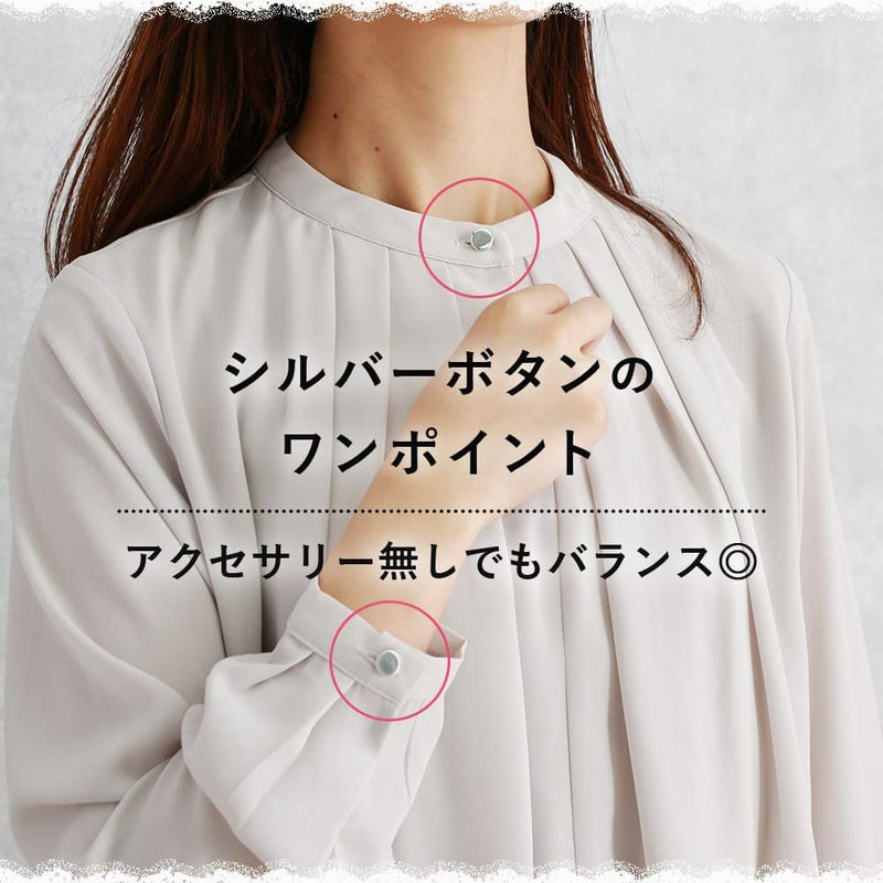 首元の詰まったデザインのブラウスでありがちな背面ボタン。留めづらく慌ただしい朝はとくに時間がかかってしまう。シルバーのボタンで首元にワンポイントを入れつつデザイン性の機能性を両立しています。