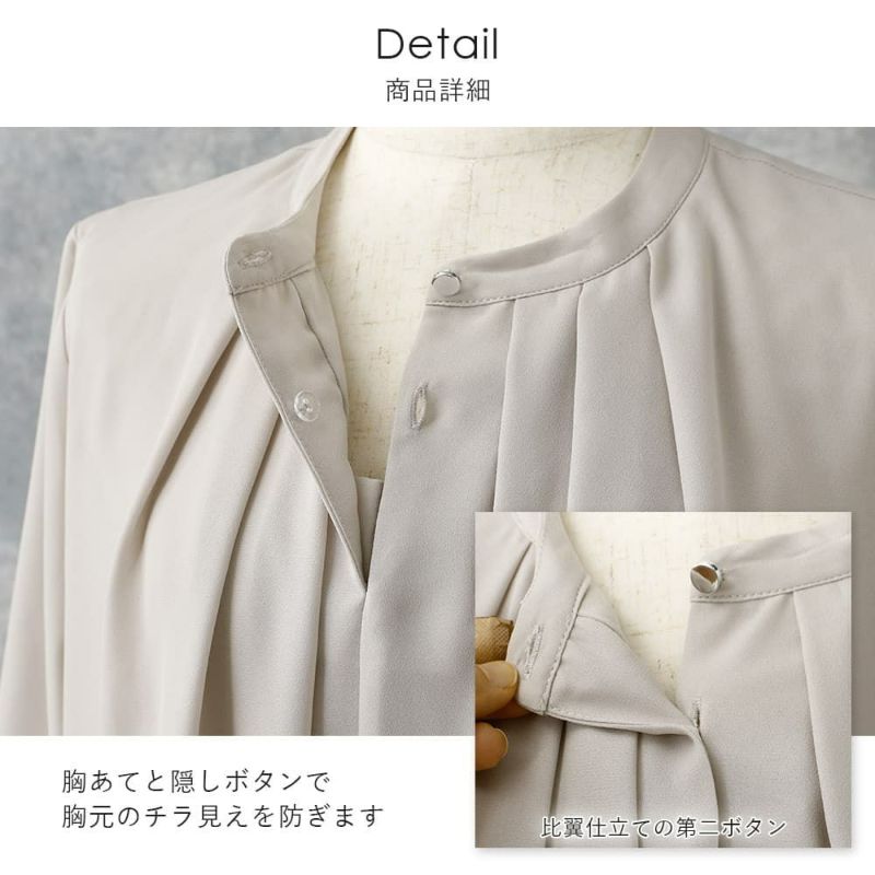 首元の詰まったデザインのブラウスでありがちな背面ボタン。留めづらく慌ただしい朝はとくに時間がかかってしまう。シルバーのボタンで首元にワンポイントを入れつつデザイン性の機能性を両立しています。