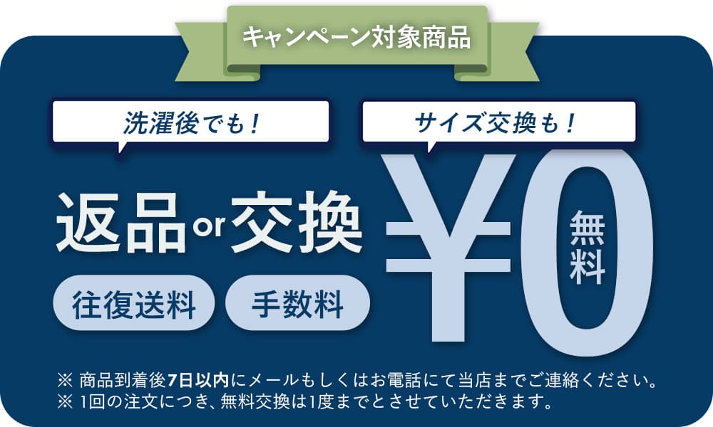 返品交換:送料手数料0円(自信があるから洗濯後でも返品OK!)