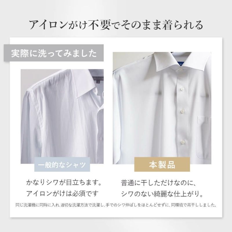 ※届いたばかりのシャツは、たたんでいた時の折りシワが残る場合がございます。気になる場合は一度軽くアイロンを掛けてからご着用ください。その後はノンアイロンでご利用いただけます。