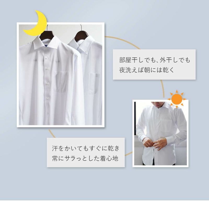 すぐ乾くから、すぐ着ることができます。部屋干しでも外干しでも夜洗えば朝には乾く速乾性。日中汗を書いてもすぐに乾き常にさらっとした着心地です。