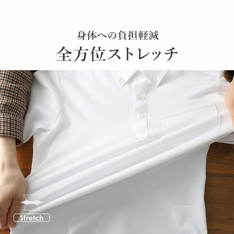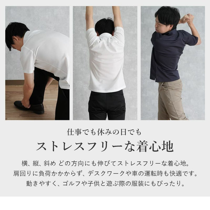 横、縦、斜め、どの方向にも伸びてストレスフリーな着心地です。肩回りに負荷がかからず、デスクワークや車の運転時にも快適です。動きやすく、ゴルフや子どもと遊ぶ際の服装にもピッタリ。もちろん通気性・速乾性に優れていて、さらっとした着心地です。