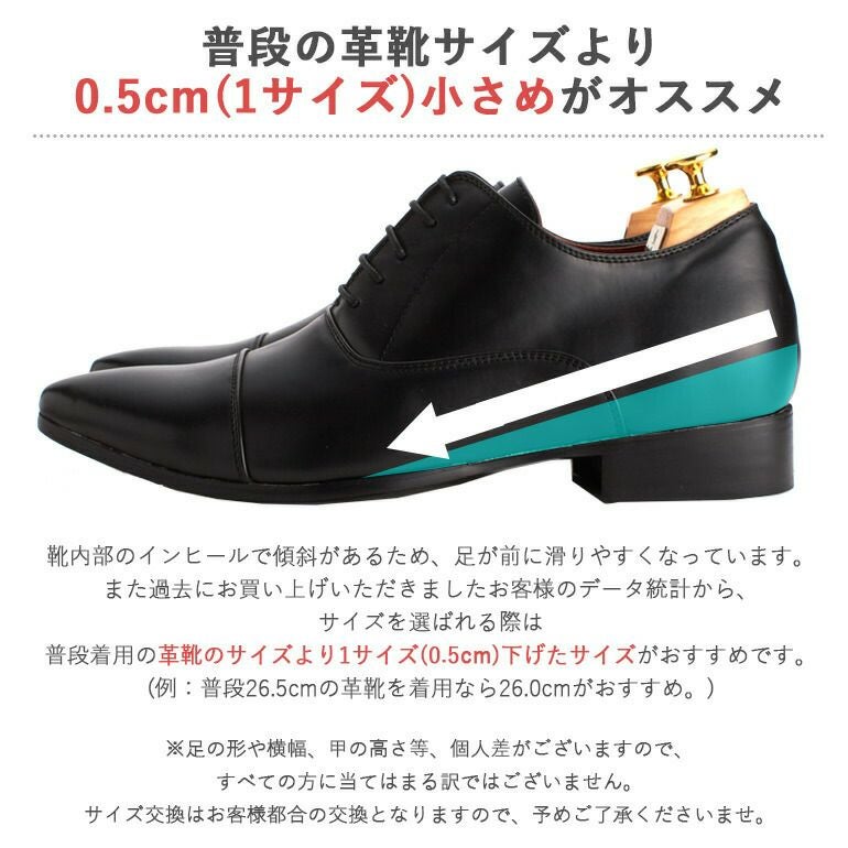 靴内部のインヒールで傾斜があるため、足が前に滑りやすくなっています。過去にお買い上げいただきましたお客様のデータ統計からサイズを選ばれる際は普段着用の革靴より1サイズ(0.5cm)下げたサイズがおすすめです。ただ、甲が高いや足の横幅が広い人は途中で止まるので通常のタイプで問題ございません。