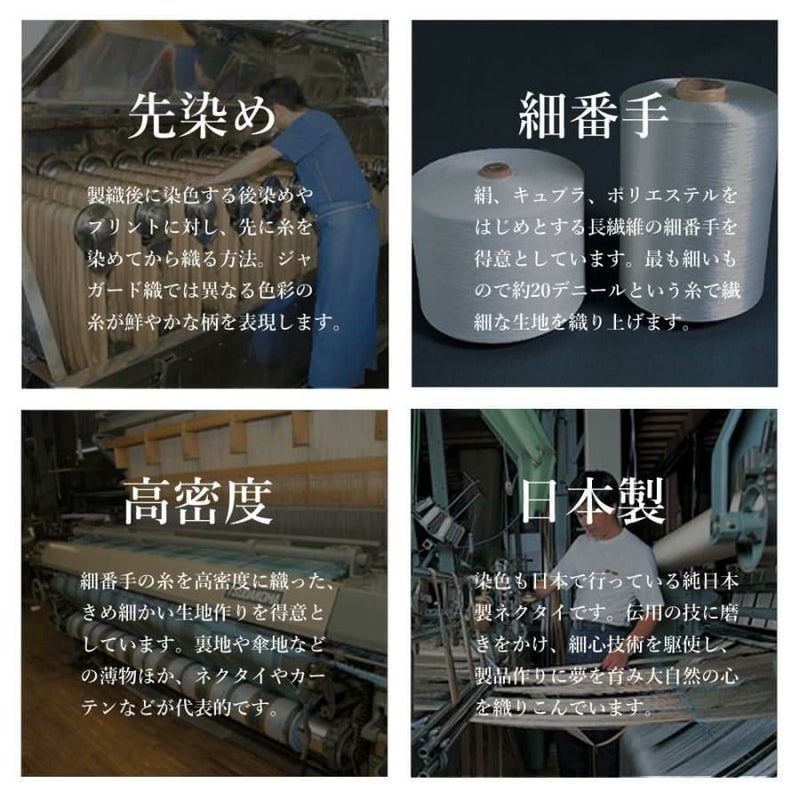 均一のミシン目、ほつれにくい端の縫い返しなどが特徴。日本の職人ならではの、性能や製品へのこだわりが世界に誇る高品質のネクタイを生み出しています。