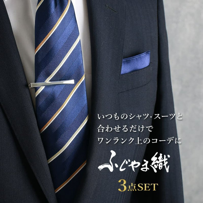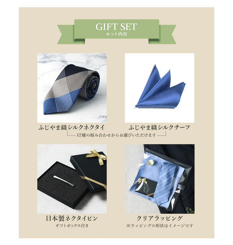 日本製のシルク100%ネクタイ+チーフ+タイピン 【ふじやま織ネクタイ・チーフ・タイピンセット】 クリアラッピング付きでギフトにもぴったり 12種から自由に選べる!