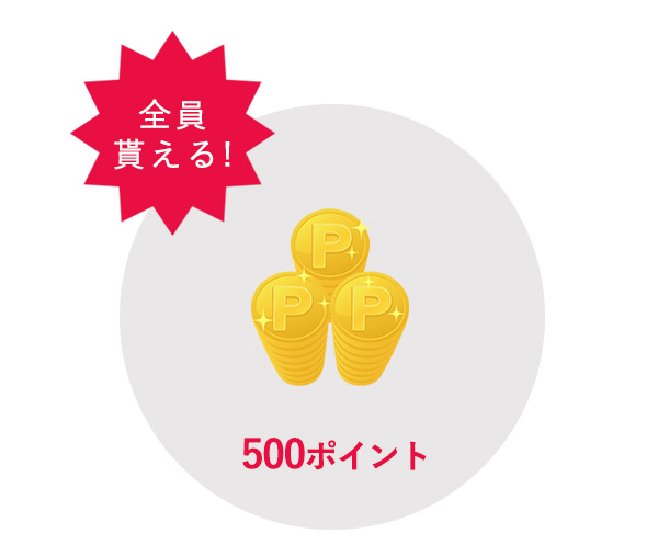 「もれなく500ポイント」は会員登録完了と同時にプレゼント致します。