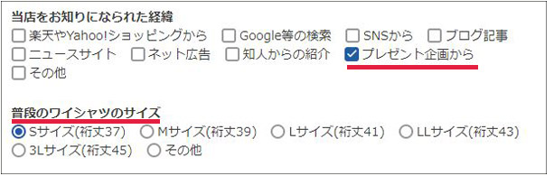 本店サイトに無料会員登録時に、アンケートにある「当店をお知りになられた経緯」という問いに「プレゼント企画から」にチェックをつけて、「普段のワイシャツのサイズ」で自分のサイズを選ぶだけ!※当選した場合、こちらでお選びになったサイズのワイシャツをお届けいたします。