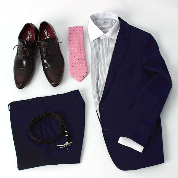 #ワイドカラー #グレー #ピンク #ストライプ #ドット #ワイシャツ #スーツ #ベルト #ビジネスシューズ #ネクタイ #オールシーズン #長袖