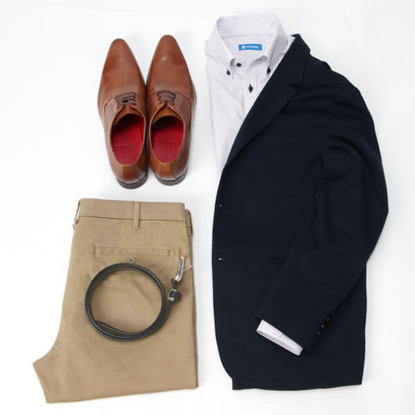 グレー系マルチストライプのボタンダウンシャツにネイビージャケットを合わせて、上半身は落ち着いたカラーでまとめました。