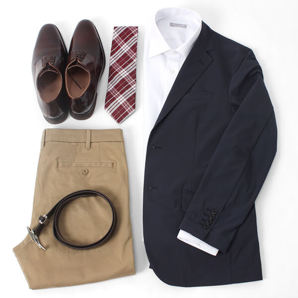 「派手かな?」と思う赤チェックのネクタイも白ワイシャツ×ネイビージャケットに合わせればうるさすぎず、爽やかにまとまります。