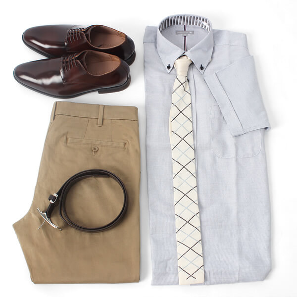 グレーの半袖シャツにアイボリーのニットタイが爽やか!