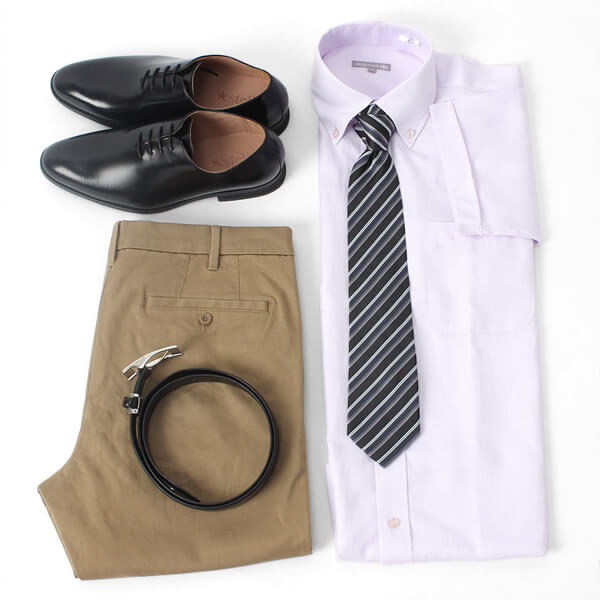 夏にぴったりな爽やかなライトパープルの半袖シャツにはあえてダークカラーのネクタイを合わせて。