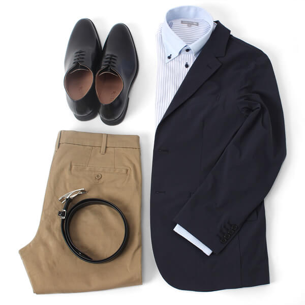 夏場のクールビズシーズンはノージャケットでもOK。身頃のホワイト×ブルーのストライプが爽やかな印象にみせてくれます。