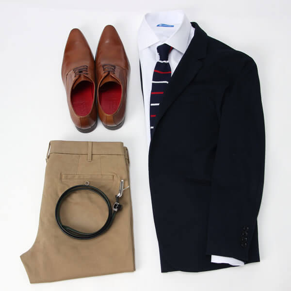 ボトムはビジネスならベージュのチノパン、カジュアルに着たいなら暗めカラーのデニムでも◎