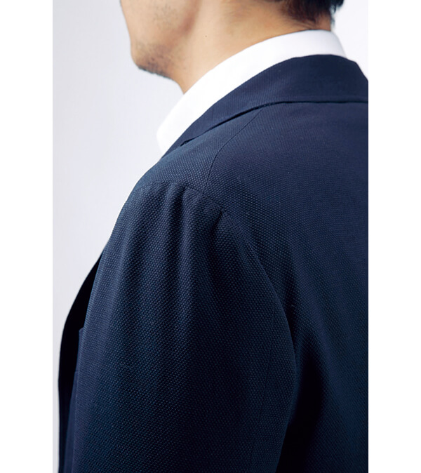 体のラインを美しく見せるスーツは、腕を通していない状態でも自然と袖が前方へと流れていくものです。