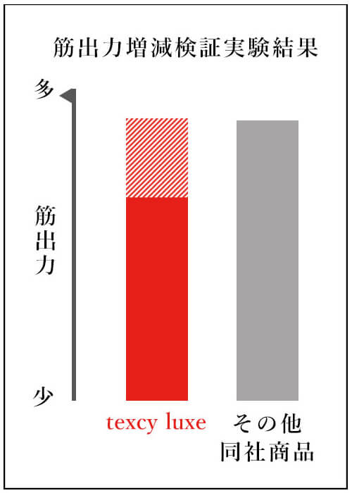 実験の結果、同社の従来品と比べテクシーリュクスはこの筋出力が最大約24%減少するということが証明されています。